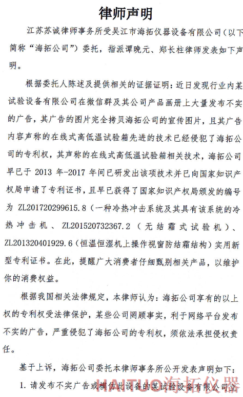 海拓儀器律師聲明:反對侵權(quán)行為 維護公司和消費者權(quán)益摘要:國內(nèi)試驗設(shè)備領(lǐng)先者吳江市海拓儀器設(shè)備有限公司委托律師事務(wù)所發(fā)布了律師聲明,該聲明指出,當(dāng)前市面上出現(xiàn)了產(chǎn)品專利侵犯海拓儀器權(quán)益,海拓儀器將以法律手段維護自身利益。該律師聲明要求某試驗設(shè)備有限公司立即停止侵權(quán)行為,扯下其在網(wǎng)絡(luò)平臺的相關(guān)廣告和宣傳畫冊并同時停止生產(chǎn)同款設(shè)備。如果該設(shè)備公司不聽勸解,海拓儀器將向人民法院依法起訴該公司侵權(quán)行為,以維護自身合法權(quán)益和維護客戶消費權(quán)益,并建議廣大消費者仔細甄別相關(guān)產(chǎn)品。? ? ? ?近日,吳江市海拓儀器設(shè)備有限公司委托律師事務(wù)所發(fā)布了律師聲明,該聲明指出,當(dāng)前市面上出現(xiàn)了產(chǎn)品專利侵犯海拓儀器權(quán)益,海拓儀器將以法律手段維護自身利益。??事件源起于海拓儀器發(fā)現(xiàn)市面上有同類設(shè)備公司通過完全拷貝海拓儀器產(chǎn)品宣傳圖片,在微信群及該公司產(chǎn)品畫冊上大量發(fā)布不實廣告。??聲明指出,該廣告聲稱的在線式高低溫試驗箱的技術(shù)侵犯了海拓儀器的專利權(quán),該產(chǎn)品專利由海拓儀器 -